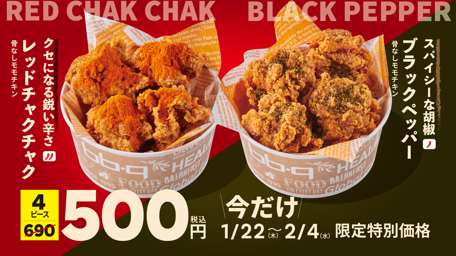 【期間限定】刺激、選べる。 クセになる鋭い辛さの「レッドチャクチャク」と スパイシーな胡椒が香る「ブラックペッパー」 骨なしモモチキンが今だけ4ピース500円(税込) 1月22日(木)~2月4日(水)